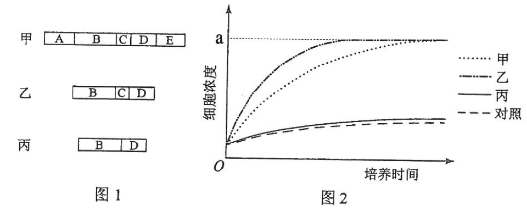 回答下列问题: (1)综合分析上图可知,干旱条件下,ABA对野生型幼苗的作用是_______。 (2)若给干旱处理的突变体幼苗施加适量的ABA,推测植物叶片的蒸腾速率会______,以对环境的变化作出反应。 (3)ABA有“逆境激素”之称,其在植物体中的主要合成部位有______(答出两点即可)。 (4)根系是植物吸收水分的主要器官。根细胞内水分的主要作用有________(答出两点即可)。 31.(10分) 为研究胰岛素的生理作用,某同学将禁食一段时间的实验小鼠随机分为A、B、C、D四组,A组腹腔注射生理盐水,B、C、D三组均腹腔注射等量胰岛素溶液,一段时间后,B、C、D三组出现反应迟钝、嗜睡等症状,而A组未出现这些症状。回答下列问题: (1)B、C、D三组出现上述症状的原因是________。 (2)B、C、D三组出现上述症状后进行第二次注射,给B组腹腔注射生理盐水;为尽快缓解上述症状给C组注射某种激素、给D组注射某种营养物质。那么C组注射的激素是__________,D组注射的营养物质是__________。 (3)第二次注射后,C、D两组的症状得到缓解,缓解的机理分别是__________________。 32.(12分) 已知某种昆虫的有眼(A)与无眼(a)、正常刚毛(B)与小刚毛(b)、正常翅(E)与斑翅(e)这三对相对性状各受一对等位基因控制。现有三个纯合品系:①aaBBEE、②AAbbEE和③AABBee。假定不发生染色体变异和染色体交换,回答下列问题: (1)若A/a、B/b、E/e这三对等位基因都位于常染色体上,请以上述品系为材料,设计实验来确定这三对等位基因是否分别位于三对染色体上。(要求:写出实验思路、预期实验结果、得出结论) (2)假设A/a、B/b这两对等位基因都位X染色体上,请以上述品系为材料,设计实验对这一假设进行验证。(要求:写出实验思路、预期实验结果、得出结论) 37.[生物——选修1:生物技术实践](15分) 绿色植物甲含有物质W,该物质为无色针状晶体,易溶于极性有机溶剂,难溶于水,且受热、受潮易分解。其提取流程为:植物甲→粉粹→加溶剂→振荡→收集提取液→活性炭处理→过滤去除活性炭→蒸馏(含回收溶剂)→重结晶→成品。回答下列问题: (1)在提取物质W时,最好应选用的一种原料是___________________(填“高温烘干”“晾干”或“新鲜”)的植物甲,不宜选用其他两种的原因是___________________________________。 (2)提取物质W时,振荡的作用是______________________。 (3)活性炭具有很强的吸附能力,在提取过程中,用活性炭处理提取液的目的是_______________________。 (4)现有丙酮(沸点56 ℃)、乙醇(沸点约78 ℃)两种溶剂,在提取物质W时,应选用丙酮作用提取剂,理由是__________________________________。 (5)该实验操作过程中应注意的事项是_________________(答出两点即可)。 38.[生物——选修3:现代生物科技专题](15分) 编码蛋白甲的DNA序列(序列甲)由A、B、C、D、E五个片段组成,编码蛋白乙和丙的序列由序列甲的部分片段组成,如图1所示。